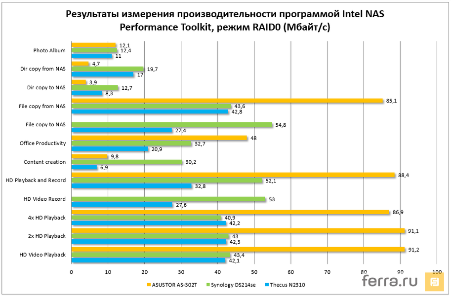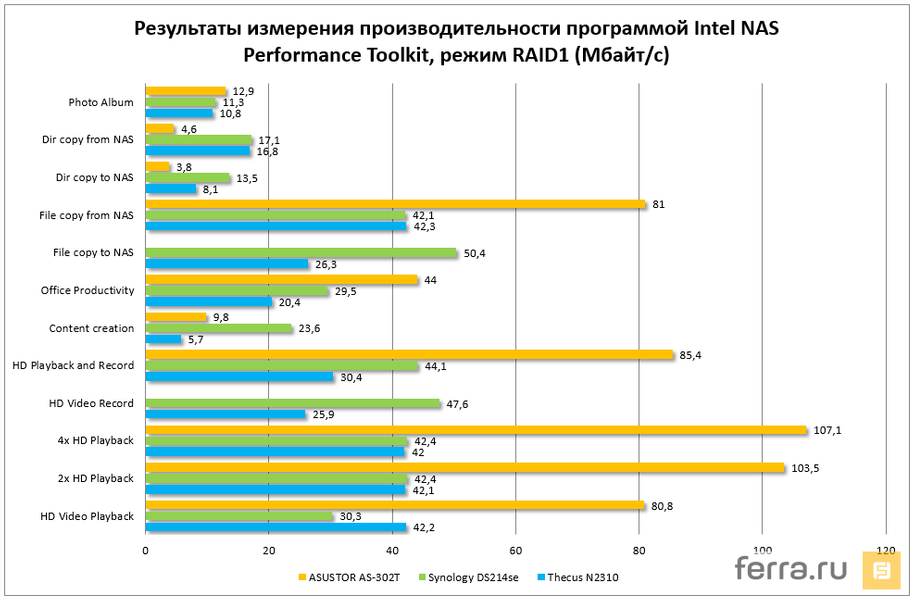 Измерения производительности осуществлялись с помощью программ Intel NAS Performance Toolkit и CrystalDiskMark. При этом компьютер был подключён напрямую к NAS через гигабитный сетевой интерфейс. Доступ к файловой системе сетевого хранилища осуществлялся по протоколу CIFS.