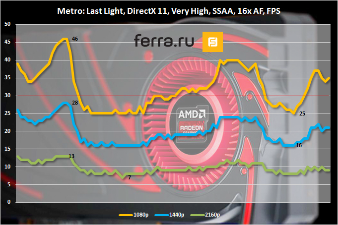 Для анализа игровой производительности я взял несколько популярных современных игр, которые имеют достаточно высокую ресурсоемкость. Были выбраны наиболее тяжелые сцены, тестирование производилось в трех разрешениях: мейнстримовом 1920х1080 (Full HD), расширенном 2560х1440 (WQHD) и сверхтяжелом 3840х2160 (Ultra HD). На графиках ниже на протяжении определенного отрезка времени показан ежесекундный уровень FPS. Минимальное и максимальное значения выделены отдельно. По среднему FPS будет проводиться сравнение с остальными видеокартами. Минимально допустимым уровнем для комфортного времяпрепровождения будем считать показатель 30 FPS.