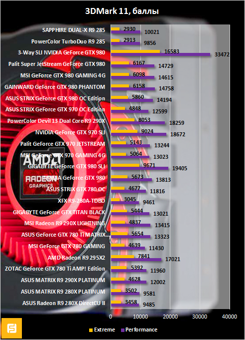 Еще один примечательный момент. В «синтетике» Radeon R9 285 в режиме Performance достаточно заметно опережает и Radeon R9 280, и Radeon R9 280X. Однако в Extreme-пресете все становится на свои места. Так, Radeon R9 280X вполне заслуженно лидирует.