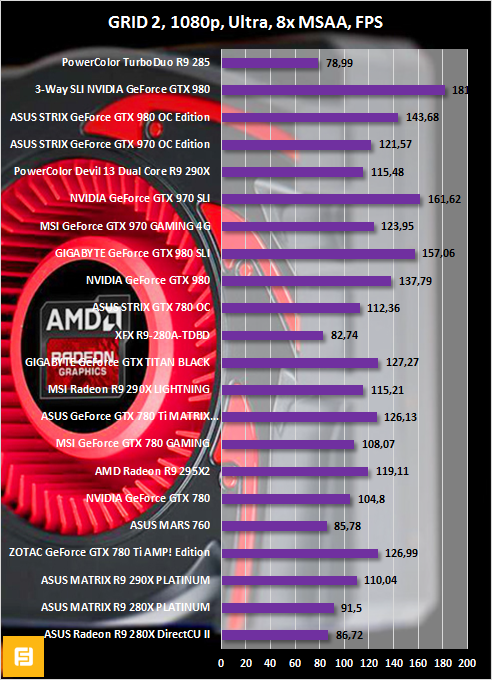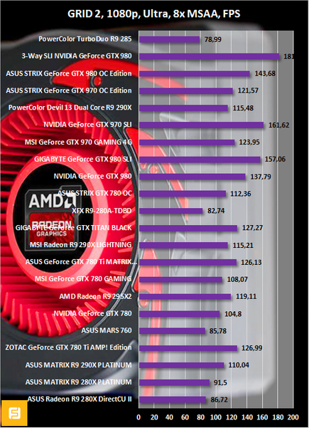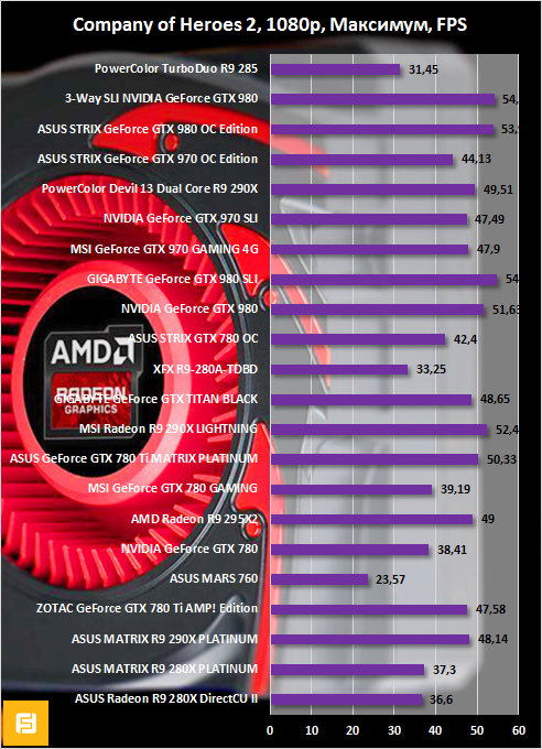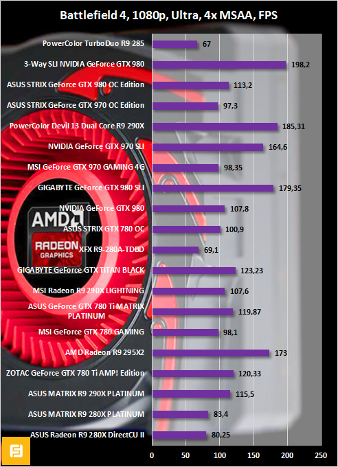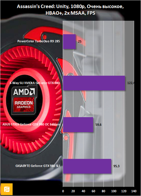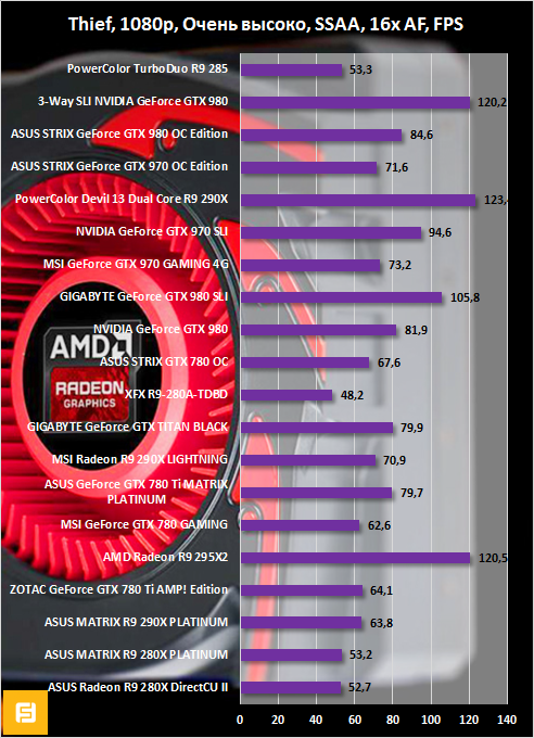 Radeon R9 280 представлена в сравнительных графиках разогнанной версией от XFX. GPU видеокарты функционирует на высокой частоте 1000 МГц. Однако у PowerColor TurboDuo R9 285 быстрее видеопамять. Вот и получается, что в одних играх чуть-чуть лидирует «двести восьмидесятая», а в других — Radeon R9 285. Но в целом оба 3D-ускорителя демонстрируют одинаковые результаты.