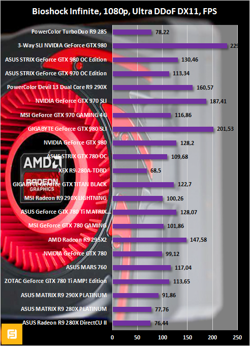 «Сапфировская» видеокарта, как мы уже выяснили, имеет более высокие частоты GPU и памяти. Поэтому неудивительно, что во всех тестах она оказывается быстрее своего аналога в лице модели от PowerColor. Разница между этими версиями Radeon R9 285 составляет где-то 1-2%. Так что преимущество DUAL-X R9 285 над TurboDuo R9 285 тяжело назвать безоговорочным.