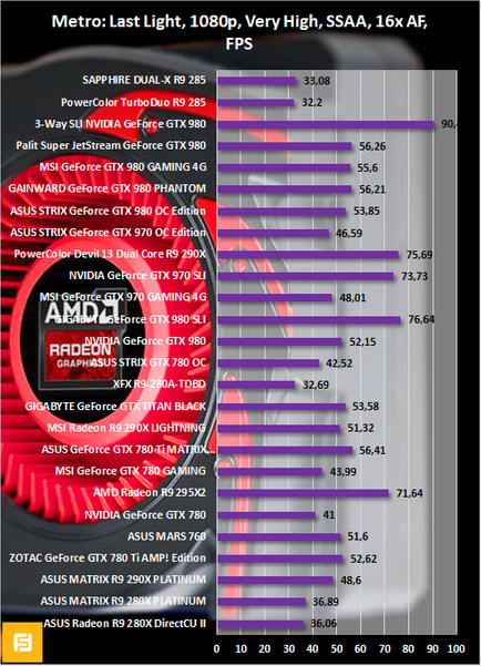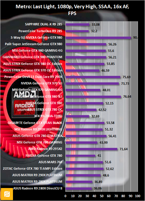 В остальных играх наблюдается та же тенденция. А именно Radeon R9 280X оказывается быстрее Radeon R9 285 где-то на 15-20%. Сказывается и наличие большего числа текстурных блоков, и более высокая частота GPU.