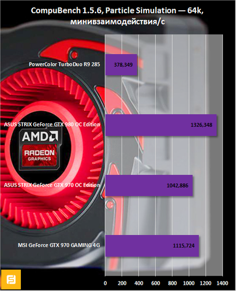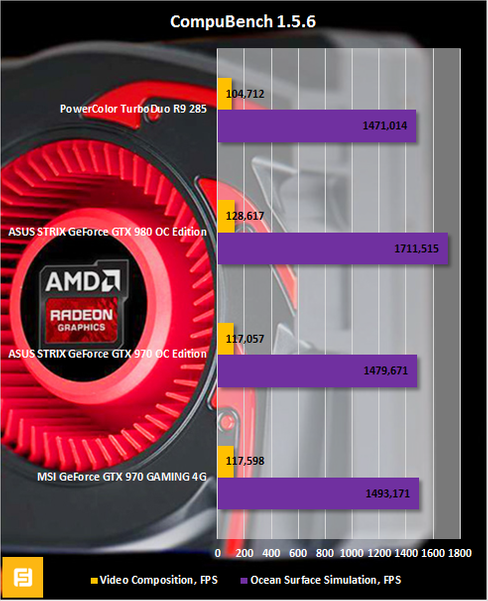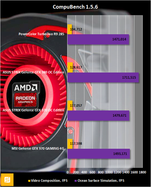 Перейдем к анализу вычислительного потенциала Radeon R9 285. В сравнительных графиках пока присутствуют только видеокарты GeForce GTX 970 и GeForce GTX 980. Очевидно, что эти графические адаптеры не могут конкурировать друг с другом. Однако на выходе я получил очень интересные результаты.