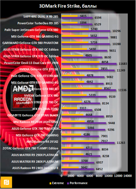 Результаты тестирования PowerColor TurboDuo R9 285 2GB GDDR5 OC (AXR9 285 2GBD5-TDHE) и SAPPHIRE DUAL-X R9 285 2GB GDDR5 OC (UEFI) после разгона в 3DMark Fire Strike