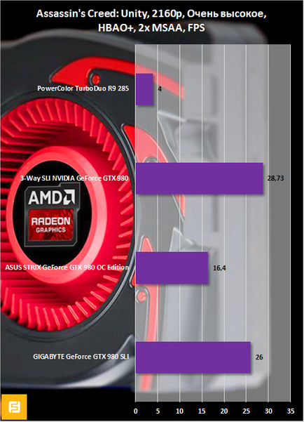 • Гейминг в Ultra HD — неудовлетворительно. Графики всё прекрасно показывают. С Radeon R9 285 на борту играть в современные игры в разрешении 4K, увы, не получится.