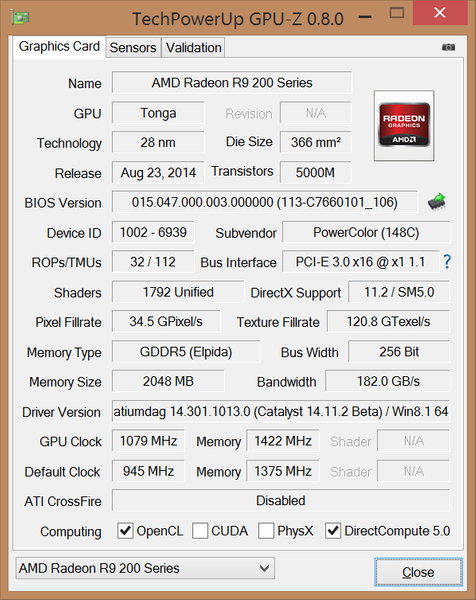 Про технические параметры и частоту GPU я уже писал в начале материала. Отмечу, что в системе используется восемь чипов памяти ELPIDA общим объемом 2 Гбайт. Маркировка — W2032BBBG-6A-F. Согласно официальной спецификации, эти чипы могут работать на эффективной частоте 6000 МГц. Однако у TurboDuo R9 285 «мозги» функционируют со скоростью 5500 МГц.
