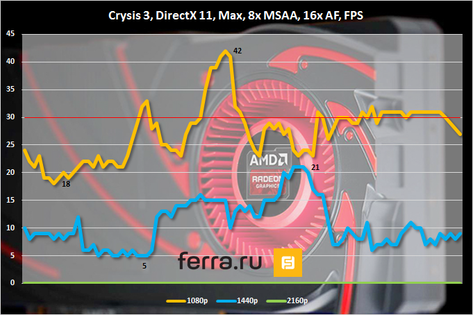 Еще одна игра, в которую не поиграть при заданных настройках качества графики даже в Full HD, — это Crysis 3. Прошло уже несколько лет, но эта часть франшизы по-прежнему наводит страх как на GPU калифорнийцев, так и на «камни» канадцев. К сожалению, в 4K с Radeon R9 285 игра вообще отказалась работать. Правда, с таким уровнем производительности делать там особо и нечего.
