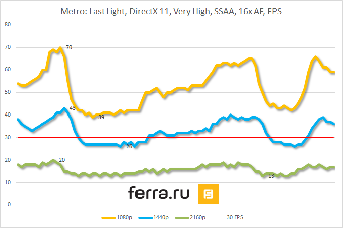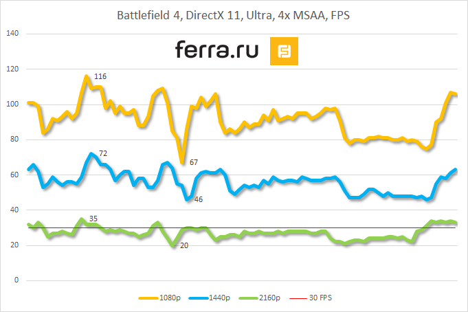 Для анализа игровой производительности я взял восемь популярных современных игр, которые имеют достаточно высокую ресурсоемкость. Были выбраны наиболее тяжелые сцены, тестирование производилось в трех разрешениях: мейнстримовом 1920х1080 (Full HD), расширенном 2560х1440 (WQHD) и сверхтяжелом 3840х2160 (Ultra HD). На графиках ниже на протяжении определенного отрезка времени показан ежесекундный уровень FPS. Минимальное и максимальное значения выделены отдельно. По среднему FPS будет проводиться сравнение с остальными видеокартами. Минимально допустимым уровнем для комфортного времяпрепровождения будем считать показатель 30 FPS.
