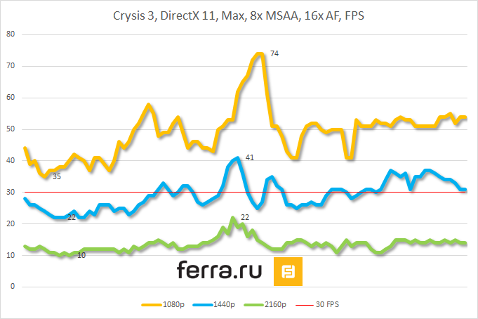 В Far Cry наблюдается схожая динамика. То есть SLI работает хорошо. Режим Ultra HD можно назвать условно играбельным, так как минимальный FPS не проседает ниже 25.