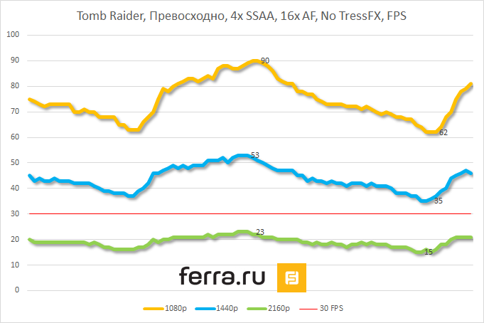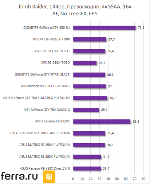 Видно, что Tomb Raider хорошо оптимизирован под SLI. Однако, как и в Metro: LL, в Ultra HD комфортного уровня кадрирования нет.