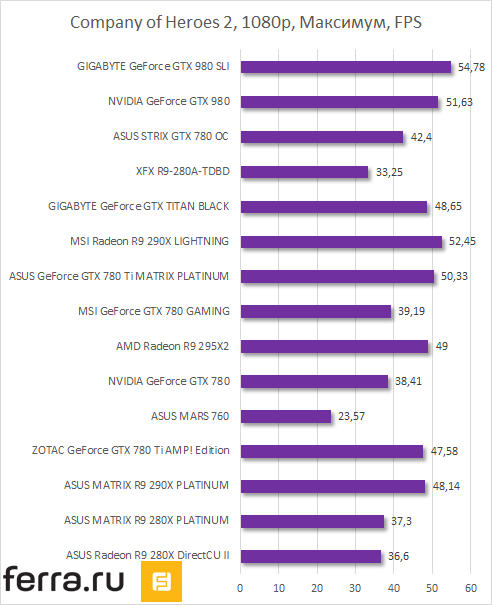 Company of Heroes 2 — пример игры, в которой SLI не работает. Разница в FPS обусловлена тем, что видеокарты GIGABYTE работают на более высоких частотах.