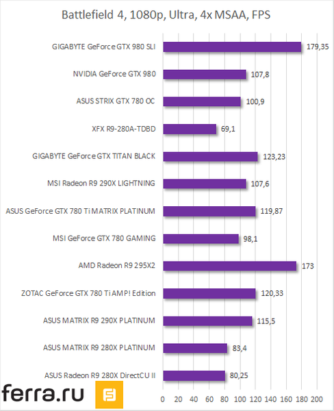 С использованием SLI теперь можно комфортно играть при разрешении WQHD. А вот в Ultra HD, увы, эффективность массива GeForce GTX 980 не позволяет говорить о достаточном уровне быстродействия.