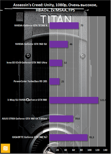 Очень интересные результаты получились при тестировании GeForce GTX TITAN X в Assassin’s Creed: Unity. Так, в Full HD разрешении героиня сегодняшней экзекуции отстала от SLI-дуэта GeForce GTX 980 на 30,5%, а от триады «девятьсот восьмидесятых» на целых 67,7%. В WQHD — на 31% и 74,6% соответственно. А в 4K-разрешении — всего на 8% и 19,7% соответственно. Столько сильное и заметное сокращение отставания GeForce GTX TITAN X от SLI- и 3-Way SLI-массивов обусловлено тем, что производительность связок GeForce GTX 980 упирается именно в нехватку видеопамяти. А у GM200 «мозгов» в расположении хоть отбавляй!