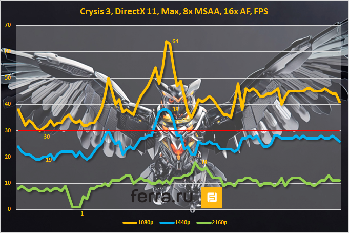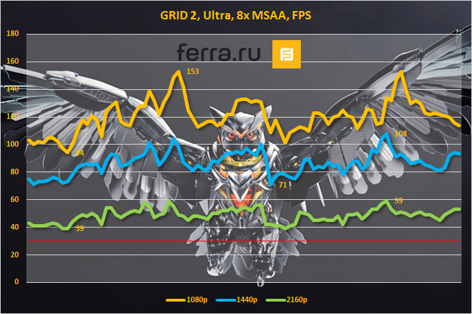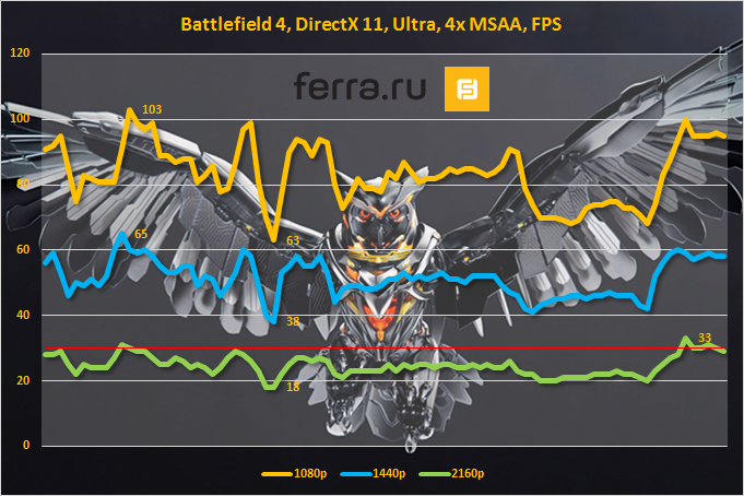 • Гейминг в Ultra HD — неудовлетворительно. Между результатами в 4К-разрешении и WQHD-разрешении расположилась целая пропасть. В данных условиях производительность видеокарты очень сильно просела.