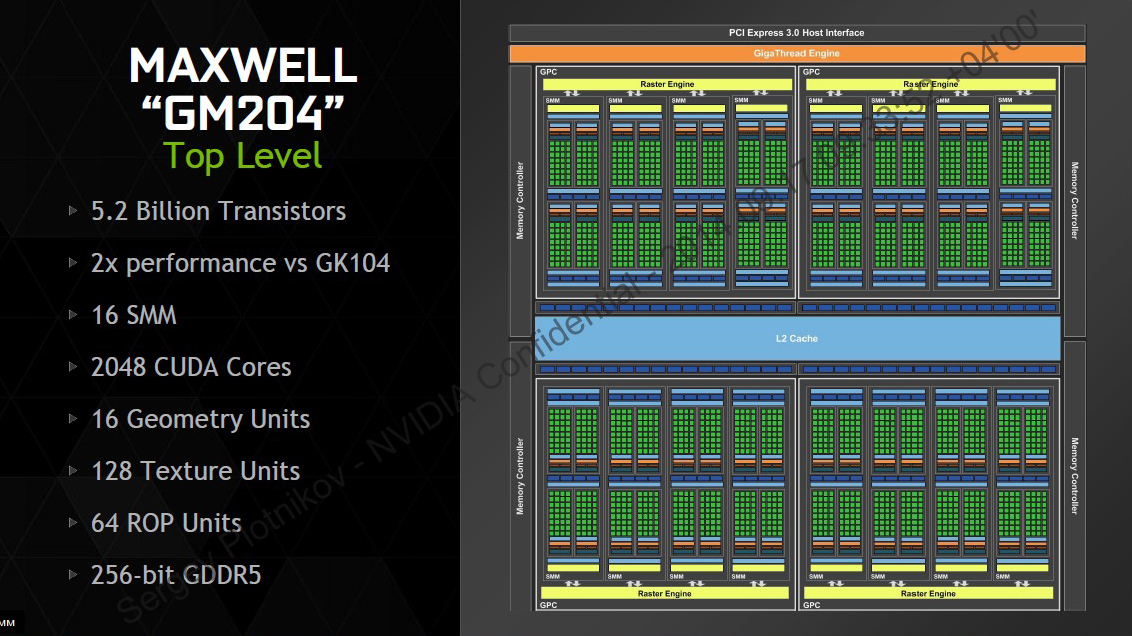 К тому же сам «камень» был несколько видоизменен. Если в GM107 используется один кластер графики, содержащий пять потоковых мультипроцессоров SMM, то в GM204 задействовано восемь кластеров графики, в каждом из которых содержится по четыре SMM.