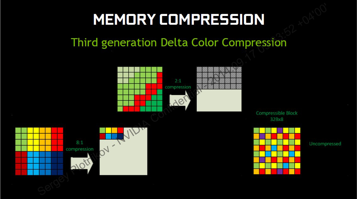 Графический процессор GM204 имеет 64 ROP. Это вдвое больше, чем у GK104. Каждый блок ROP может обрабатывать один цвет. Для уменьшения требований к видеопамяти был задействован метод компрессии без потерь. Архитектура Maxwell поддерживает уже третье поколение дельта-сжатия (первое было реализовано в Fermi). Далеко не маленькую роль играет большой кэш GPU. В проведенных тестах GeForce GTX 980 использует приблизительно на 25% меньше байтов на кадр, чем GeForce GTX 680. В итоге пропускная способность на уровне 7 Гбит эквивалентна параметру 9,3 Гбит.