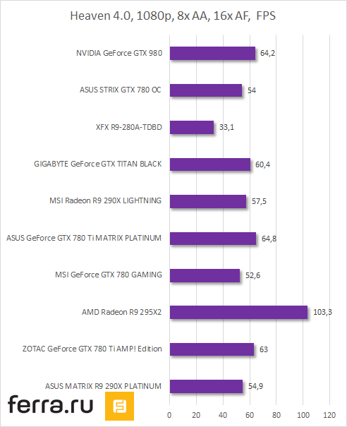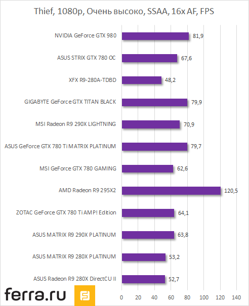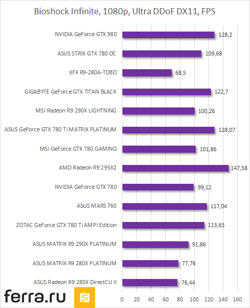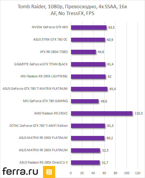 В остальных играх прослеживается схожая тенденция. Matrix-версия GeForce GTX 780 Ti от ASUS оказывается чуть быстрее референсной GeForce GTX 980, а она чуть производительнее кастомных Radeon R9 290X. Но стоит учесть, что MATRIX-GTX780TI-P-3GD5 функционирует на частоте 1006 (1072) МГц, в то время как референсная GeForce GTX 780 Ti работает со скоростью 875 (928) МГц. Следовательно, GeForce GTX 980 будет быстрее нее.