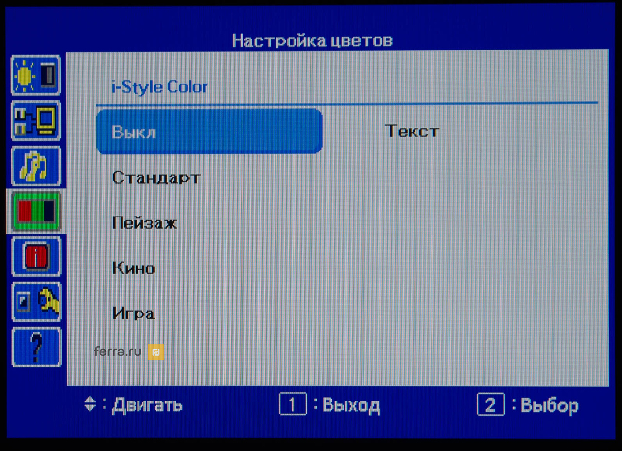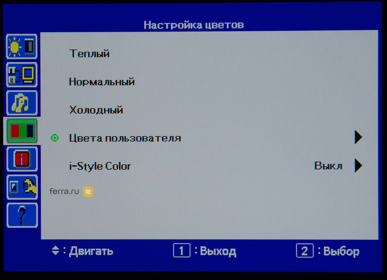 Страница «Настройка цветов» позволяет управлять цветовой температурой как среди трёх предустановленных профилей, так и с помощью регулировки трёх цветовых каналов: красного, синего и зелёного.