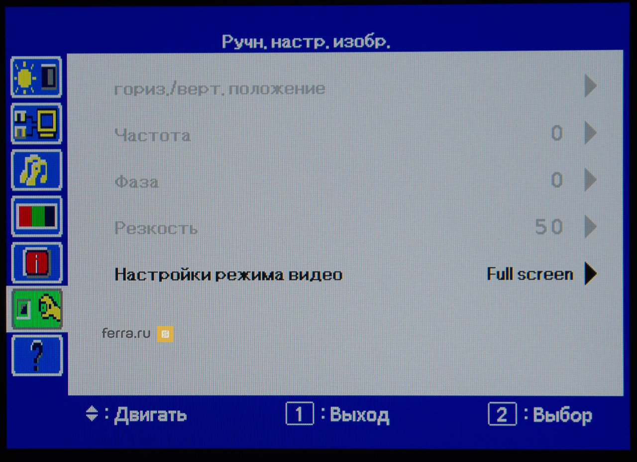 Основные настройки предоставляет первая страница меню, вызываемая сенсорной клавишей «1». Это яркость, контрастность, динамическая подстройка контрастности, режим экономии энергии и управлению скоростью матрицы. Последняя имеет пять положений. Однако, если вы переключитесь на один из предустановленных цветовых режимов, то все эти настройки будут заблокированы, за исключением скорости отклика матрицы.
