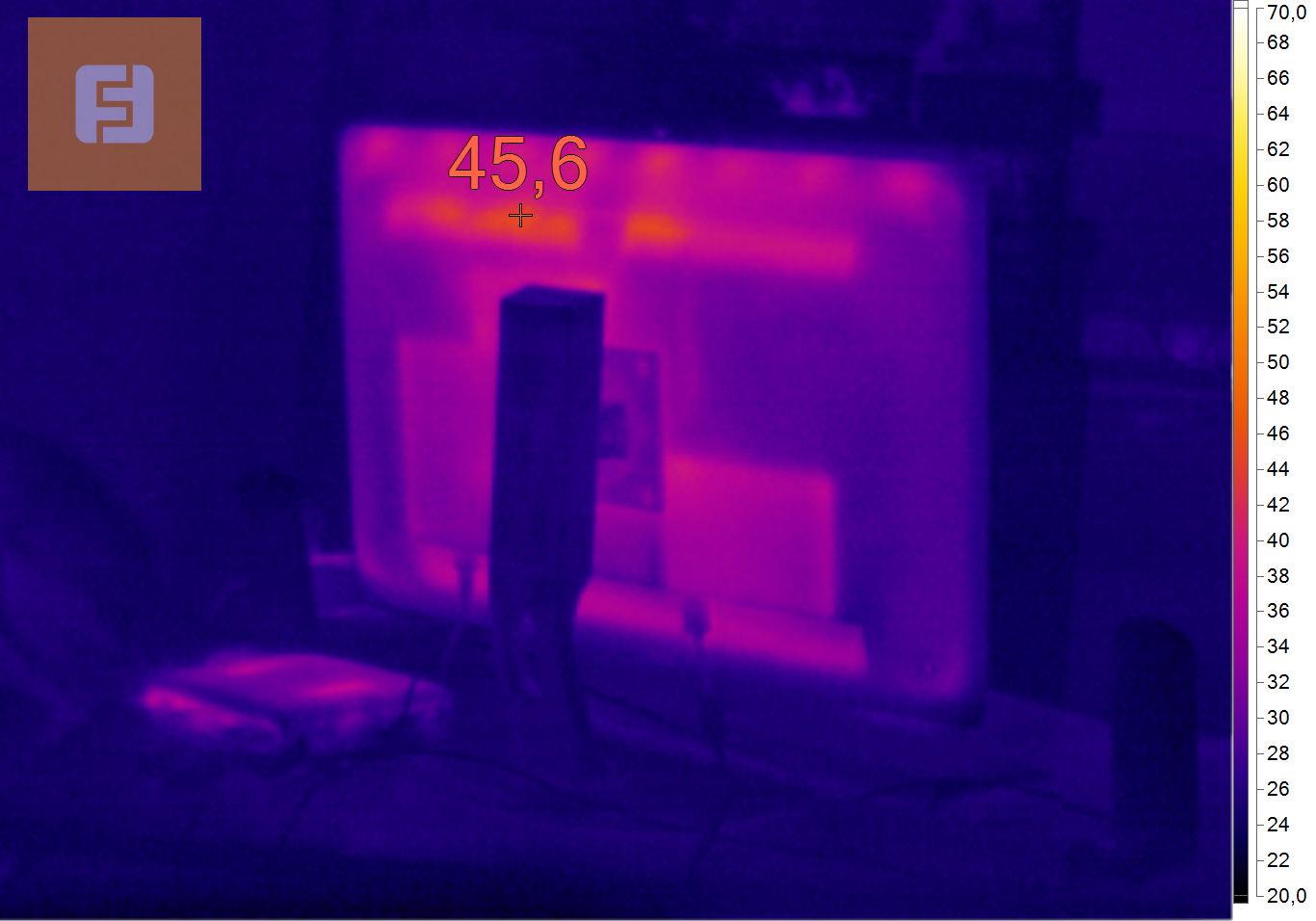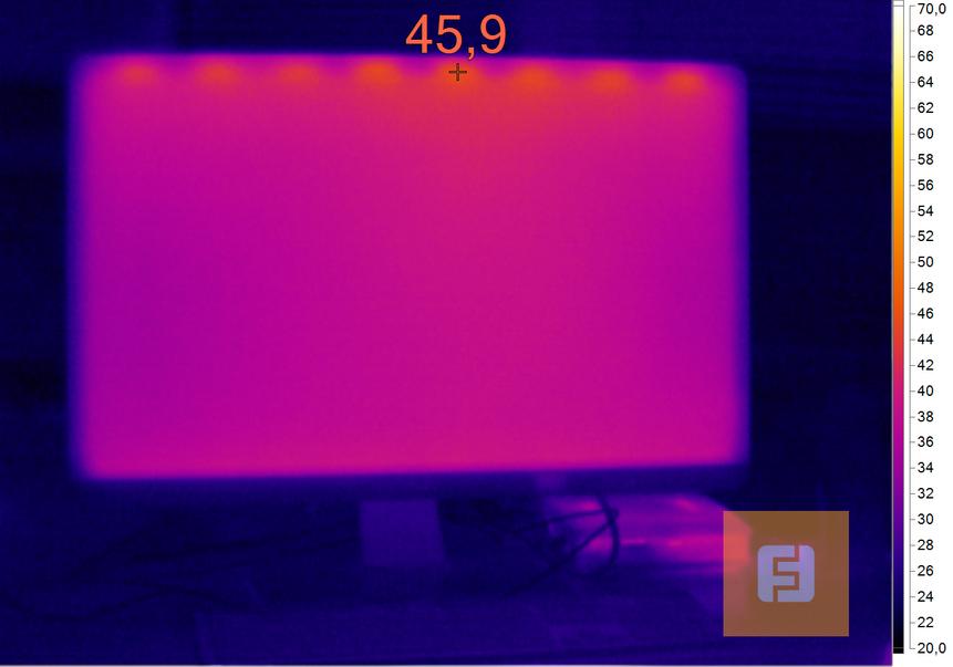 Температура поверхности монитора и его энергопотребления — на них точно не стоит ориентироваться, но можно ознакомиться просто для расширения кругозора. Ничего удивительного перед нами не предстало — тёплый воздух поднимается вверх, сосредотачиваясь у верхней кромки монитора. А энергопотребление укладывается в норму.