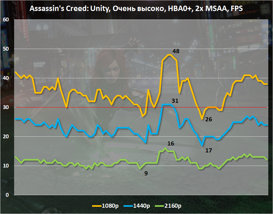 Начнем, пожалуй, с самых ресурсоемких приложений современности. А именно с двух версий Assassin’s Creed. Работают они на одном движке, кстати. Это заметно невооруженным взглядом, так как при одинаковом уровне настроек качества графики средний FPS в играх оказался сопоставимым, хотя многие игровые журналисты отмечают, что по качеству изображения Unity выглядит лучше. Понятно, что Assassin’s Creed — это конвейер. Но за год, на мой взгляд, разработчики могли бы и лучше оптимизировать игру, ведь за отведенное время никаких прорывных технологий ни со стороны AMD, ни со стороны NVIDIA не вышло.