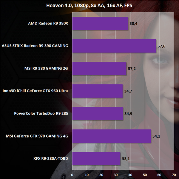 Более интересные результаты продемонстрировала синтетика под названием Heaven. В разрешении WQHD Radeon R9 380X опередила и Radeon R9 380 (всего на 3%), и GeForce GTX 960 (на 16,6%), но уступила Radeon R9 280X. Такое вполне возможно, ведь Antigua XT и Tahiti XTL обладают схожими характеристиками. Следовательно, в противостоянии двух близких видеокарт (при условии, что производительность не упирается в объем памяти) последнее слово говорят частоты. Уже в разрешении Ultra HD быстродействие видеокарт с 2 Гбайт упирается именно в нехватку ресурсов 3D-ускорителя.