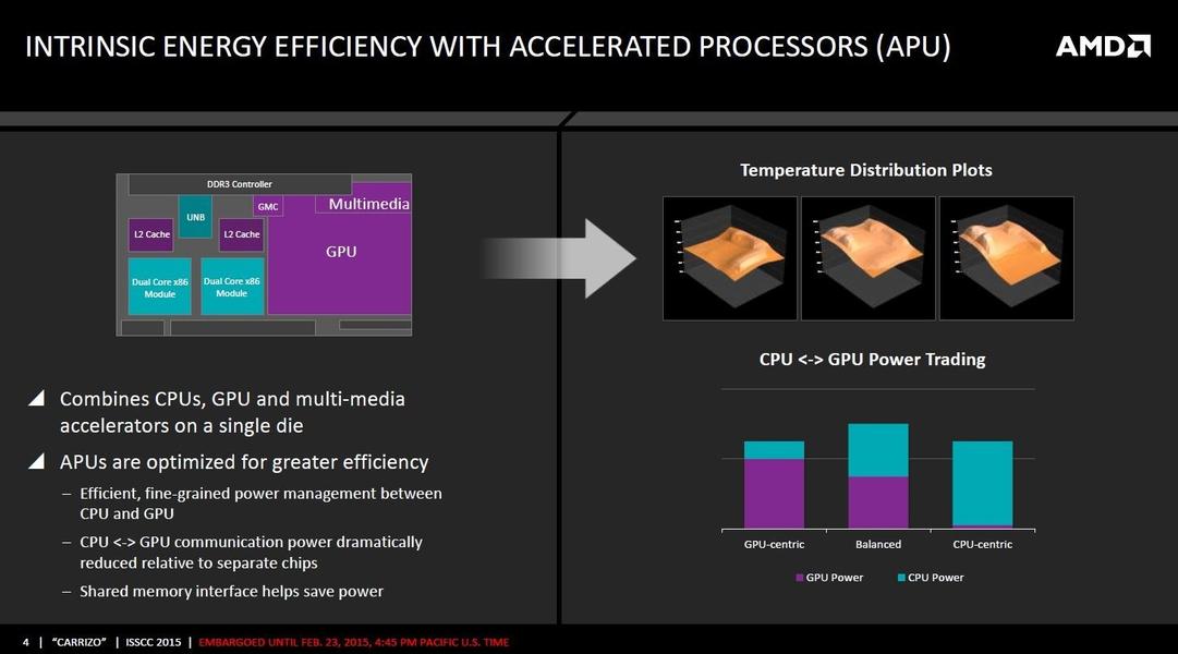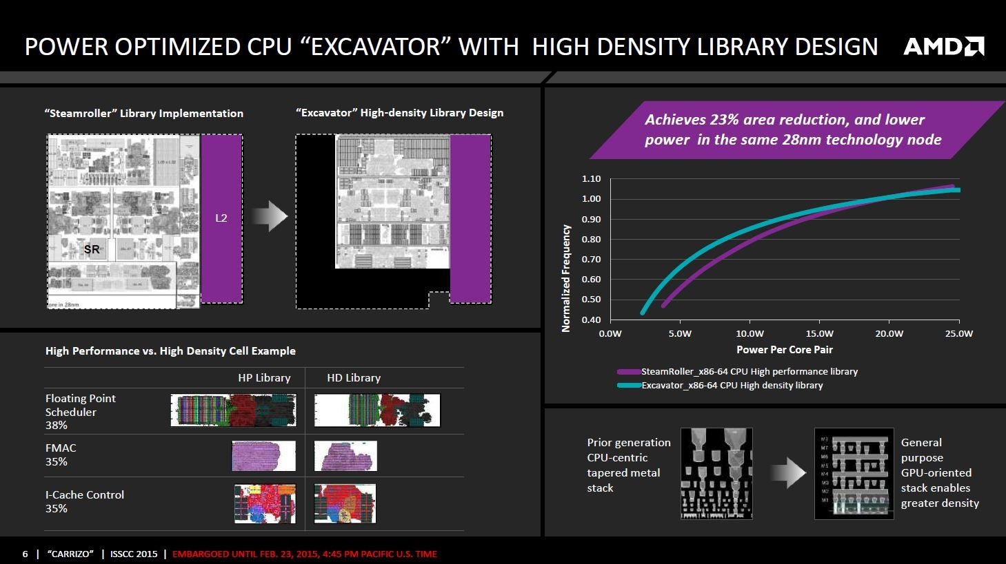 Компания AMD достаточно подробно рассказала о мобильных процессорах Carrizo, появление которых ожидается во втором квартале года. Эти решения претендуют на звание самого большого чипмейкерского прорыва последних лет. Процессоры строятся по 28-нанометровому техпроцессу и получили ряд существенных изменений, что дает большое преимущество по энергоэффективности по сравнению с текущим поколением APU Kaveri. Самое большое изменение кроется в модуле CPU Excavator, который стал на 23% меньше и на 40% энергоэффективнее, чем Steamroller, изготовленный по тому же 28-нанометровому техпроцессу. Excavator отличается дизайном библиотеки высокой плотности с уменьшенной областью подложки. Большинство компонентов также уменьшено, включая блок вычислений с плавающей точкой уменьшили на 38%, на 35% блоки FMAC (fused multiply-accumulate, совмещенное умножение-сложение с однократным округлением), а контроллер кэша инструкций — еще на 35%. Чип Carrizo сам по себе использует оптимизированный для GPU металлический стек высокой плотности для большей компактности. Каждый модуль Excavator получил два ядра x86-64 CPU. Carrizo содержит 3,1 миллиарда транзисторов, для сравнения — Haswell-D имеет 1,4 миллиарда. Алгоритм адаптивного напряжения снижает энергопотребление на 19% для CPU и на 10% для GPU. Что касается графики, то она базируется на архитектуре Graphics CoreNext 1.3 с восемью вычислительными блоками, аппаратным ускорением H.265, поддержкой Mantle API с DirectX 12. Так, встроенный GPU более чем в 3,5 раза превосходит Kaveri по производительности при перекодировании видео.