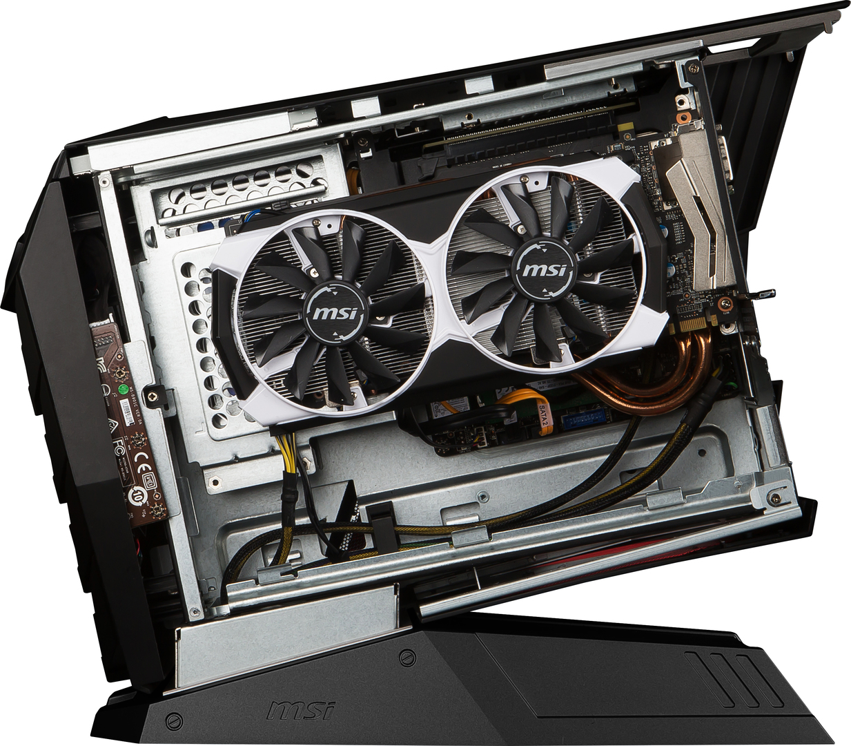 Основная идея — это компактные размеры (433×376×170 мм). Подставка «Аегиса» одновременно играет роль блока питания мощностью всего 350 Вт. Однако платформа поддерживает установку процессора Intel Core i7-6700 и одной видеокарты NVIDIA GeForce GTX 970.