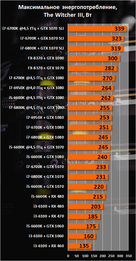 А сколько потребляет современная игровая система? Вот не верят, когда говоришь, что тому же Core i7-6700K и одной GeForce GTX 1080 в разгоне вполне достаточно блока питания на честные 450 Вт. Для большей наглядности приведу три графика с реальными измерениями. Для теста я использовал ваттметр watts up? PRO, который ведет лог потребляемой мощности. Указаны пиковые параметры. В первом случае нагрузкой служила игра «Ведьмак 3». Во втором случае — одновременный запуск LinX 0.6.5 и FurMark. На крайнем правом графике отображена пиковая мощность системы — сумма уровня типичного тепловыделения процессора, максимального энергопотребления видеокарты и дополнительных 100 Вт, отведенных под нужды материнской платы, оперативной памяти, корпусных вентиляторов и накопителей (с запасом).