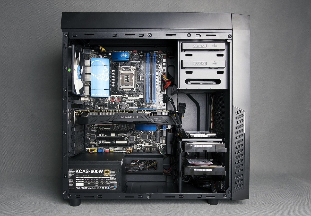 Для большей наглядности я собрал систему в классическом Midi-Tower-корпусе. Использовал популярный и недорогой ZALMAN R1. Кейс добротный, но за шасси у него тесновато. У GIGABYTE XP1200M длина 24-пинового кабеля составляет 700 мм. Поэтому пришлось исхитриться, чтобы проложить такую «колбасу» за шасси ZALMAN R1. Реально помогает, что сами провода — плоские. Это еще один эксплуатационный плюс блоков питания. Очевидно, что стезя GIGABYTE XP1200M — топовые кейсы.