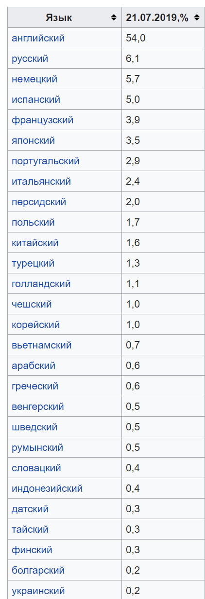 По состоянию на 2019 г. большинство сайтов в мире остаются англоязычными, но русскоязычный сегмент интернет-ресурсов по-прежнему сохраняет второе место.