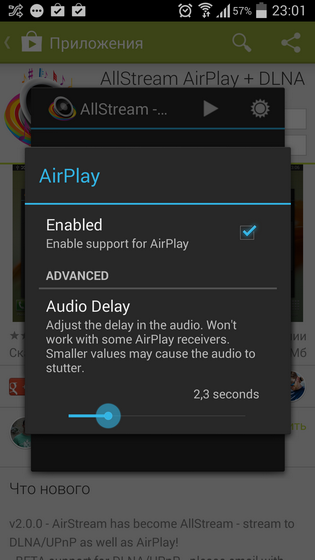AllStream научилась передавать звук не только по AirPlay, но и посредством протокола DLNA, стандартного для многих «продвинутых» устройств. Это и послужило причиной переименования программы. Немаловажно, что задержку при передаче звука по AirPlay теперь можно регулировать (это позволит свести дискомфорт при просмотре фильмов и роликов на YouTube к минимуму).