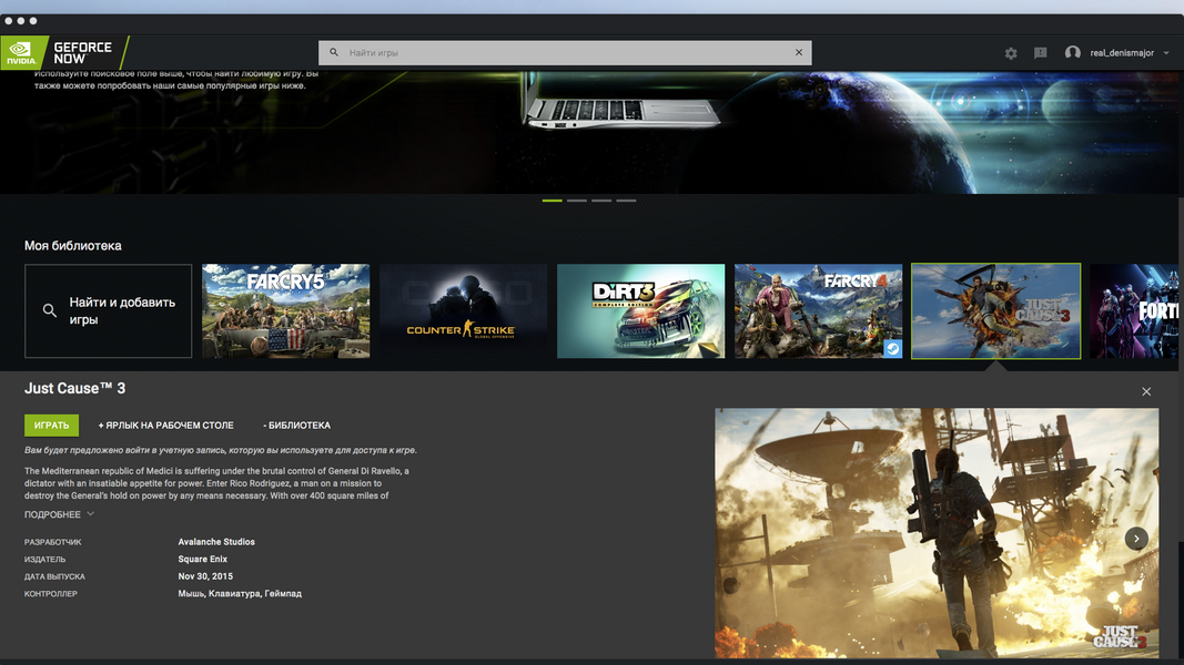 А ещё поддерживаемая GeForce Now игра может находиться сразу в нескольких магазинах - например, Far Cry 5 есть и в Steam и в Uplay. У меня этот ФарКрай куплен не в Steam, а в Uplay, поэтому я не сразу разобрался, как поставить правильную версию. Если вбить в строку поиска Far Cry 5, то высветятся обе версии, но у той, что из Steam, будет небольшой логотип магазина в углу. А вот у версии для Uplay никаких дополнительных логотипов на картинке игры нет.