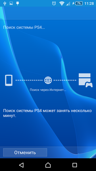 1. Выбираем в приложении первый вариант подключения и нажимаем кнопку "Далее". Устройство начнёт поиск консоли. Если смартфон и PS4 находятся в одной Wi-Fi сети, то довольно быстро произойдёт подключение и вы сможете пользоваться всеми функциями. Если же они не могут найти друг друга, то смартфон начнёт искать PS4 через интернет по подключению к PlayStation Network. Как показывает опыт, такой поиск чаще заканчивается успехом.