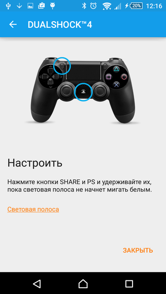 2. Берём в руки джойстик от PS4 и зажимаем кнопки SHARE и PS до тех пор, пока световая полоса не начнёт мигать белым. Таким образом мы отключаем геймпад от консоли и разрешаем другим устройствам находить его по Bluetooth.
