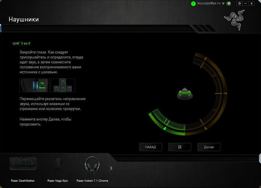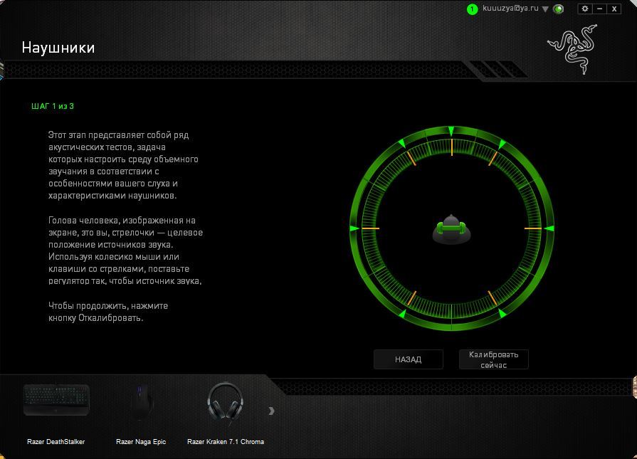 Как мы и говорили ранее, за настройку наушников отвечает специальное программное обеспечение Razer Synapse 2.0, которое может хранить все настройки в облаке. В первую очередь наушники нужно будет откалибровать, чтобы очень точно настроить стороны, откуда поступает звук.