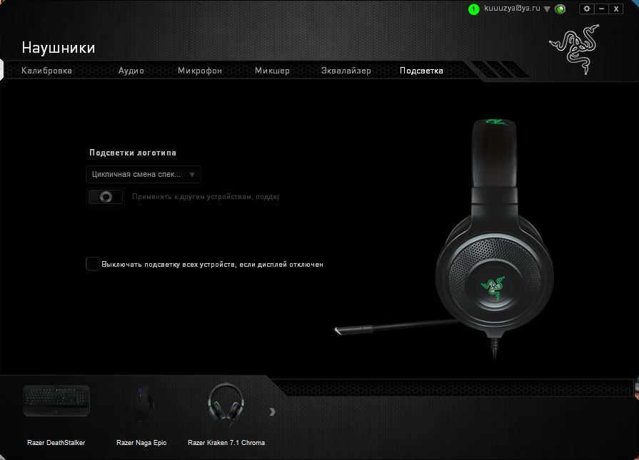 • Static: выбранным цветом подсвечиваются амбушюры Kraken 7.1