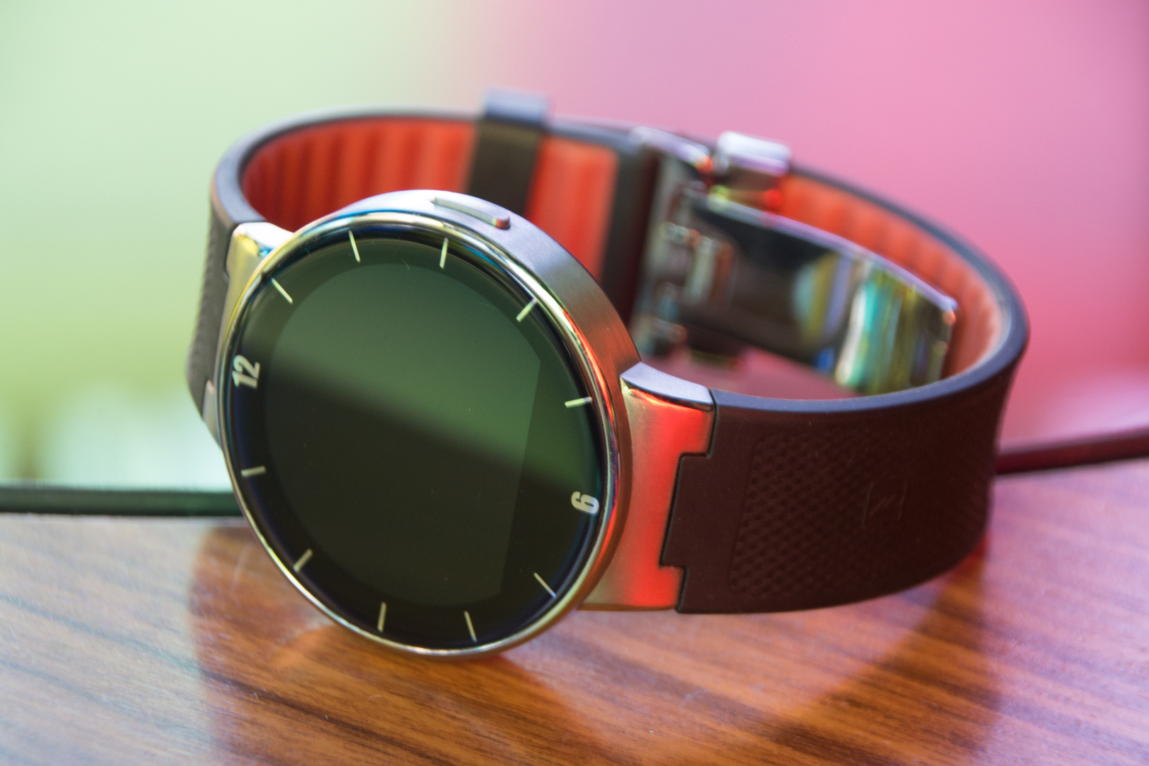На руке часы смотрятся неплохо, хотя для крупного мужского запястья они уже немного мелковаты. Но это всё же лучше, чем массивный и толстый корпус LG Watch Urbane. One Touch выглядят элегантно, в частности, из-за металлического корпуса и циферблата на стекле. У нас на тесте была мужская версия, а вот дамская выглядит немного иначе. Она выполнена из такой же стали, отличия заключаются лишь в цвете ремешка (белый с серым) и ободке вокруг экрана, который тоже белый, а не чёрный. Версия для дам выглядит немного интереснее и больше похожа на обычные часы, нежели чёрно-красная мужская.