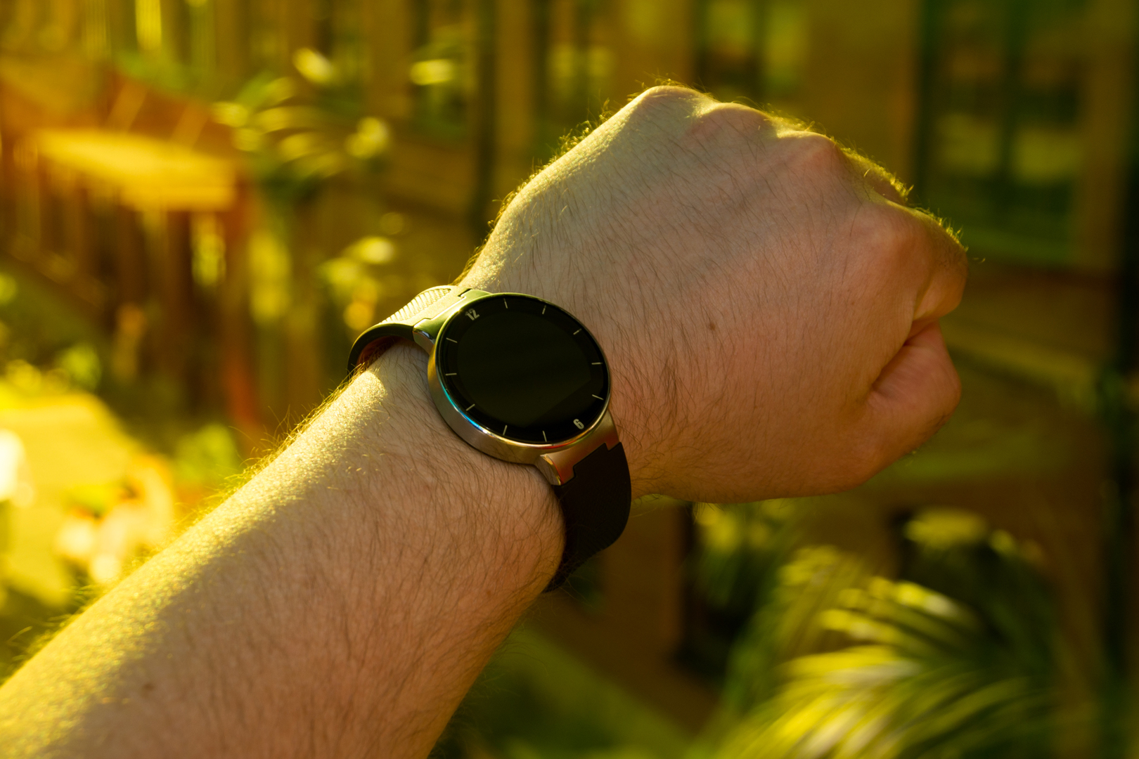Первое, на что стоит обратить внимание, это на круглый дисплей. Сейчас часы с такими экранами можно пересчитать по пальцам одной руки: Moto 360, LG Watch Urbane и анонсированные, но ещё не выпущенные Huawei Watch. К сожалению, только в модели LG экран полностью круглый, а вот в Alcatel One Touch Watch, как и в Moto 360, есть чёрная мёртвая зона внизу. В Moto 360 там находится датчик освещённости, а вот в часах Alcatel это просто сенсорная кнопка для открытия меню или возврата назад. Однако весь интерфейс разработан так, что эта зона не слишком бросается в глаза. В часах же Motorola на Android Wear очень заметно, что дисплей не совсем круглый.