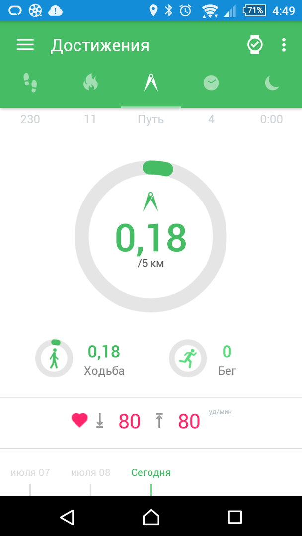 Итак, запустили приложение, подключились по Bluetooth к часам — и всё готово. В приложении тут же отобразятся все ваши результаты за текущий день, такие как количество пройденных шагов, сожжённые калории, время активности, пройденное расстояние и продолжительность последнего сна.