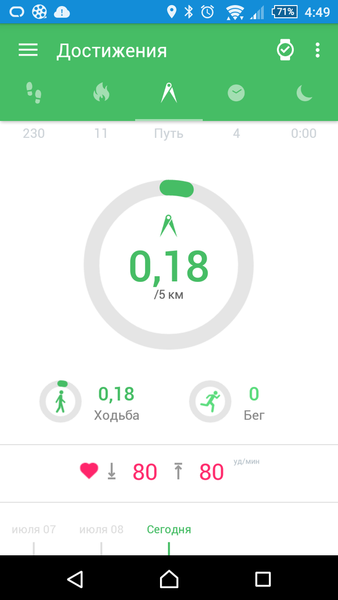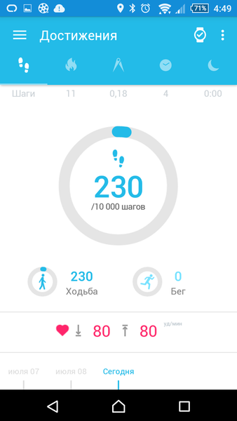 Статистику устройство предоставляет довольно подробную, причём часы различают ходьбу и бег. Фазы сна гаджет тоже умеет определять, вот только почему-то не использует это для работы будильника. Приложение позволяет настроить свои цели, чтобы каждый день было к чему стремиться. В целом, программа информативная, но до уровня того же Jawbone ещё далеко. Зато приятно удивила русификация: никаких китайских иероглифов или некорректных словосочетаний здесь нет, всё понятно и хорошо переведено.