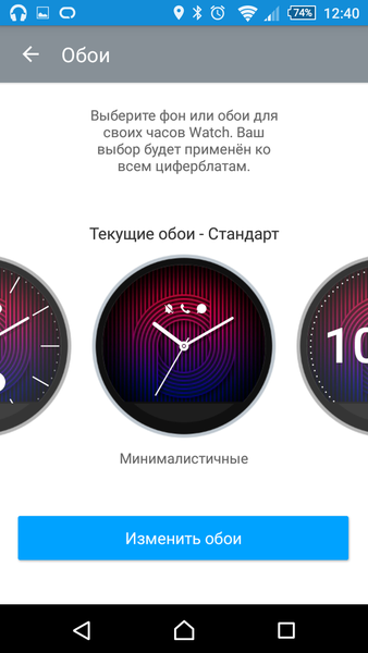 Основная настройка часов также производится из приложения. Здесь устанавливается будильник, но увы, только на фиксированное время, никаких тебе умных будильников. Тут же меняется стиль циферблатов. Есть три основных типа: классический, минималистичный и цифровой. А дальше уже нужно выбирать обои, которых в приложении представлено аж 24 штуки. Помимо обоев можно залить фон часов одним из 16 предложенных цветов.