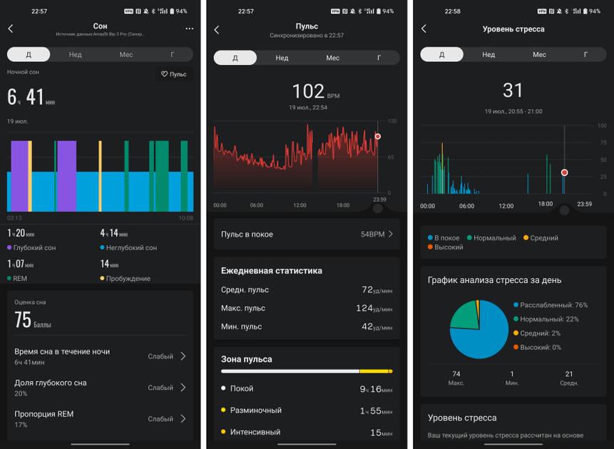 Часы отлеживают более 60 типов активности и тренировок, включая сквош, скакалку, разные виды танцев, зимние виды спорта, единоборства, различные игры с мячом. За счет датчиков реализован круглосуточный мониторинг сердечного ритма, отслеживание насыщения крови кислородом, также Amazfit Bip 3 Pro следят за циклом, уровнем стресса, определяют фазы сна и дают оценку его качеству. Для уличных тренировок доступна запись маршрута с использованием модуля GPS. В целом часы играют в любительской лиге: по совокупности характеристик это не модель для профессиональных спортсменов, однако достаточно функциональный гаджет для всех, кто увлечен активным образом жизни и хочет быть информированным о показателях организма.
