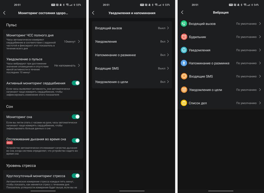 В приложении Zepp также доступно много настроек работы самих часов. За ними — на третью вкладку «Профиль». Там можно выбрать опции мониторинга состояния здоровья, например, выбрать оптимальную периодичность измерений для баланса между информативностью приложения и автономностью продукта, настроить работу уведомлений (если что, показываются только четыре строки текста, ответы с часов не предусмотрены), задать разную вибрацию для разных видов оповещений.