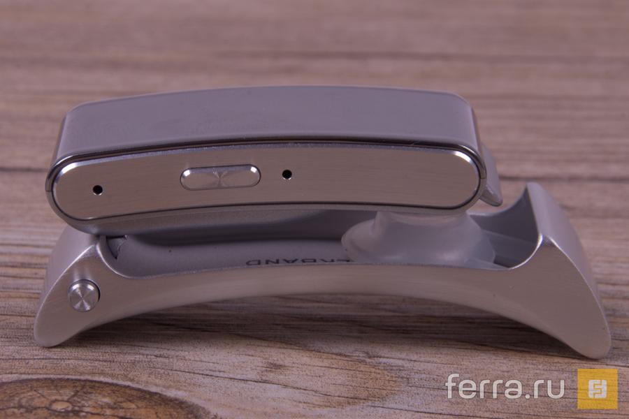 Вынимать и вставлять гарнитуру в крепление удаётся одной рукой, но не всегда с первого раза. Для этого достаточно одновременно нажать на две кнопки по бокам и гарнитура выскочит из браслета, иногда этот механизм срабатывает не до конца и приходится прикладывать небольшое усилие, чтобы вытащить гаджет. Впрочем, это мелочи, за день привыкаешь и проблем в использовании не возникает. Вернуть гарнитуру в браслет ещё проще, главное не ошибиться стороной, хотя конструкция и не позволит это сделать. Просто вставляем устройство в креддл, защёлкиваем и вот у нас снова браслет.