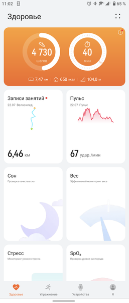 Вся статистика с часов выгружается в фирменное приложение “Здоровье”, где может быть подвергнута более детальному анализу. Но вот выгрузить в популярную “страву” уже не получится, приложение не поддерживает интеграцию с другими спортивными сервисами. Суб-бренды Xiaomi уже давно научились это все делать, причем без “костылей” в виде дополнительных программ.