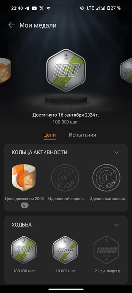 Ну и куда же без ачивок. У HUAWEI Health есть отдельный раздел с наградами, которые выдаются за активность и преодоление определённых рубежей в нелегком спортивном деле.