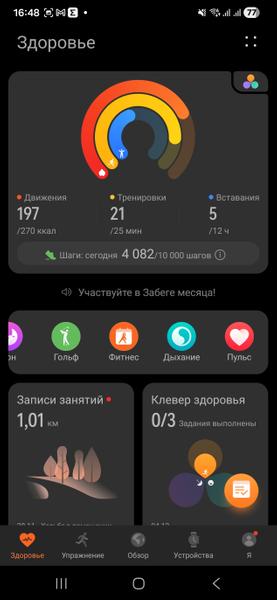 В часы встроен 1,5-дюймовый экран с технологией LTPO AMOLED. Напомню, LTPO означает, что экран может работать с переменной частотой обновления. Правда, достоверную информацию, с какой максимальной частотой обновления работает экран, я так и не нашёл. В некоторых источниках указано 60 Гц, но, наблюдая экран своими собственными глазами, я в это не верю. «На глаз» здесь как минимум 90 Гц, а то и все 120 Гц. Ну а если всё же 60, пусть эти мои слова будут комплиментом плавности, оптимизации и скорости отклика.