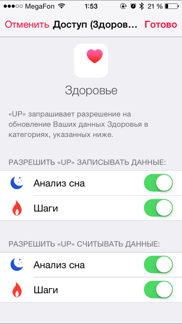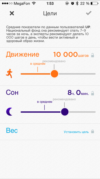 Основным экраном приложения является страница с вашими текущими результатами и лентой активности. В этой ленте отображаются все ваши достижения, а также данные о друзьях, которые тоже пользуются продуктами Jawbone. Таким образом, вы можете следить за прогрессом своих знакомых, а они за вашим. Кроме того, на основном экране периодически высвечиваются различные советы по питанию или активному образу жизни. Важной деталью в новых версиях программы на iOS является то, что данные можно отправить в проприетарную программу Apple Здоровье.