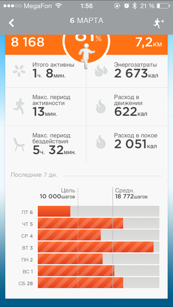 Ещё один круглый гаджет для измерения активности и мониторинга сна. Отличительной особенностью тут является маленький экран, а не светодиоды, но и в качестве элемента питания уже не часовая батарейка, а аккумулятор, который надо раз в неделю заряжать. Возможности такие же, как у UP или Shine, да и приложение очень похожее, но немного проще и менее информативно.